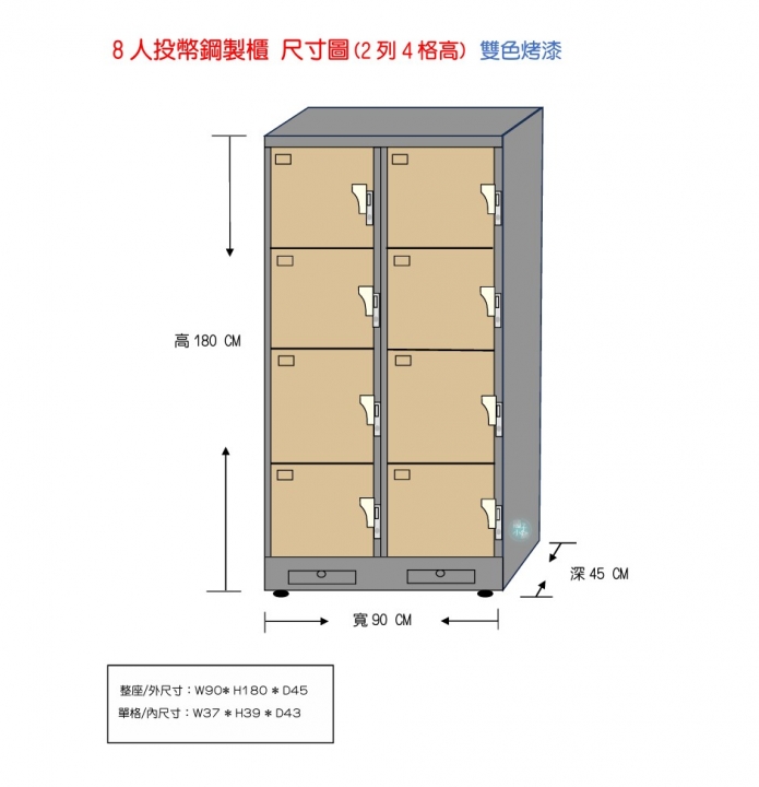 4人鋼製櫃-投幣鎖/行李箱/寄物櫃(加重處理) 寬100 高200 深60 公分